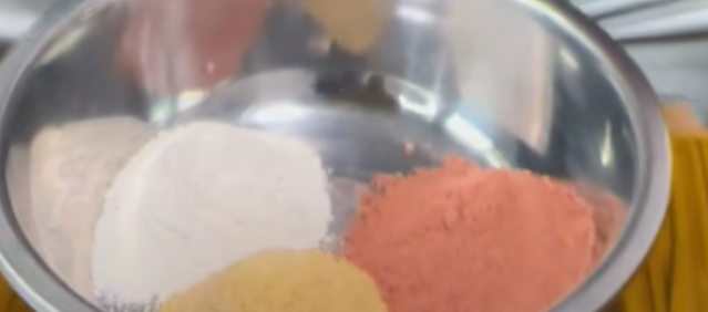 准备谷物香,加入半份的谷物香,再加入半份的拉丝粉,把它搅拌均匀。按照1:0的饵水比,加入三杯半的水,把它搅拌均匀,让其吸水,静置五分钟。