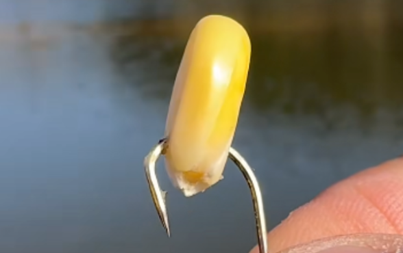 第三步,系上子线双钩并上好两颗新鲜玉米抛到水里去。