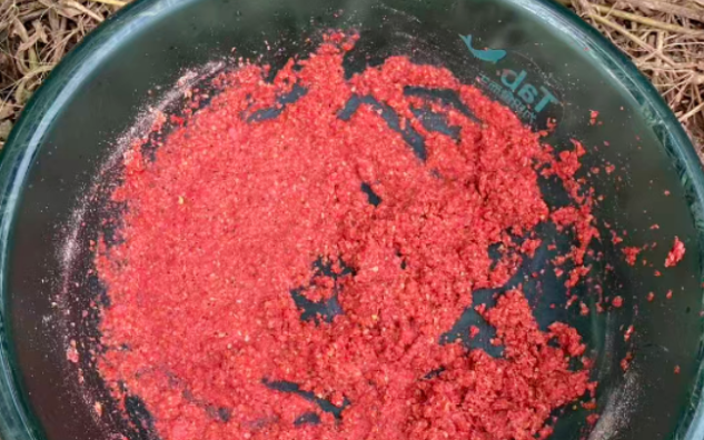 如果想要追求更高的鱼货,想要追求更高的中鱼率,就把腥香饵料买回来,用小粉磨一磨,粉完以后加10%的虾粉,再适当的添加3%的面粉,增加一下粘度,再把红虫给揉进去。红虫最好用那种小牙的红虫,有点就行。